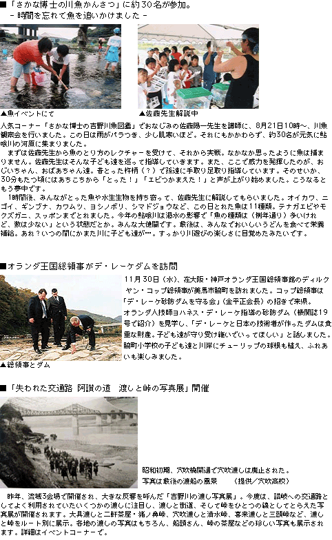 ●吉野川ニュース ・「さかな博士の川魚かんさつ」に約30名が参加。 時間を忘れて魚を追いかけました ・オランダ王国総領事がデ・レーケダムを訪問 ・「失われた交通路 阿讃の道 渡しと峠の写真展」 開催 |