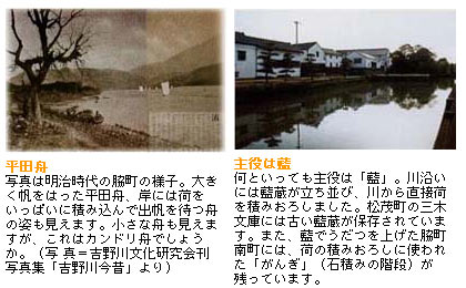 「春の東風が吹く時分になると、吉野川に白い帆をたてて舟がようけ行っきょった」−そう話してくれた人の目は、懐かしさに満ちていました。悠々と水をたたえた吉野川をゆく帆掛け船、人々でにぎわう川湊・・・・・。今は古い写 真や資料でしか見ることが出来ない風景を確かめてみたくなり、吉野川に残る川湊の跡を訪ねてみました。藩政〜明治時代は、吉野川が物流の主役として最も輝いていた時代です。当時は自動車も鉄道もなく、舟こそが唯一の大量 運送の手段で、最盛期には1000を超える川舟が行き来していたと言われています。1艘の積載量 は600貫(2.25t)〜1000貫(3.75t)というから、その機動力たるや、他の輸送手段(馬や人)とは比べものにならなかったのです。