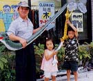 ■流木でかんたんアート 吉野川は素材の宝庫だ! 徳島市北田宮でクリーニング店を営む松田計一さんは、流木アートの名人です。店の前には、ヘビのファミリー、真っ赤なイノシシ、キリンなど、松田さんの作品がずらりと並んでいます。