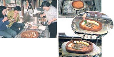 「ひらら」とは「平たい」の意味で、鉄板の代わりに平たい石と、味付けに味噌を使ったバーベキューのような料理です。祖谷地方では、都会から帰省した家族や客をもてなす料理のひとつとして古くから伝えられています。庭先や川原で大勢が集まって行うこともあり、渓流でとれる魚や山の名物のこんにゃくや豆腐、季節の野菜などをふんだんに使って作ります。ひらら焼きは、何と言っても石探しが一苦労。この地方で「みそ石」と呼ばれる粘土質のやわらかい石ですが、厚ければ熱が通 りにくく薄すぎると割れます。それにちょうど良くても熱を通しますから2、3度使えば割れてしまうのです。